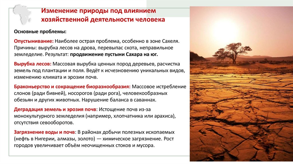 Опустынивание: Наиболее острая проблема, особенно в зоне Сахеля.