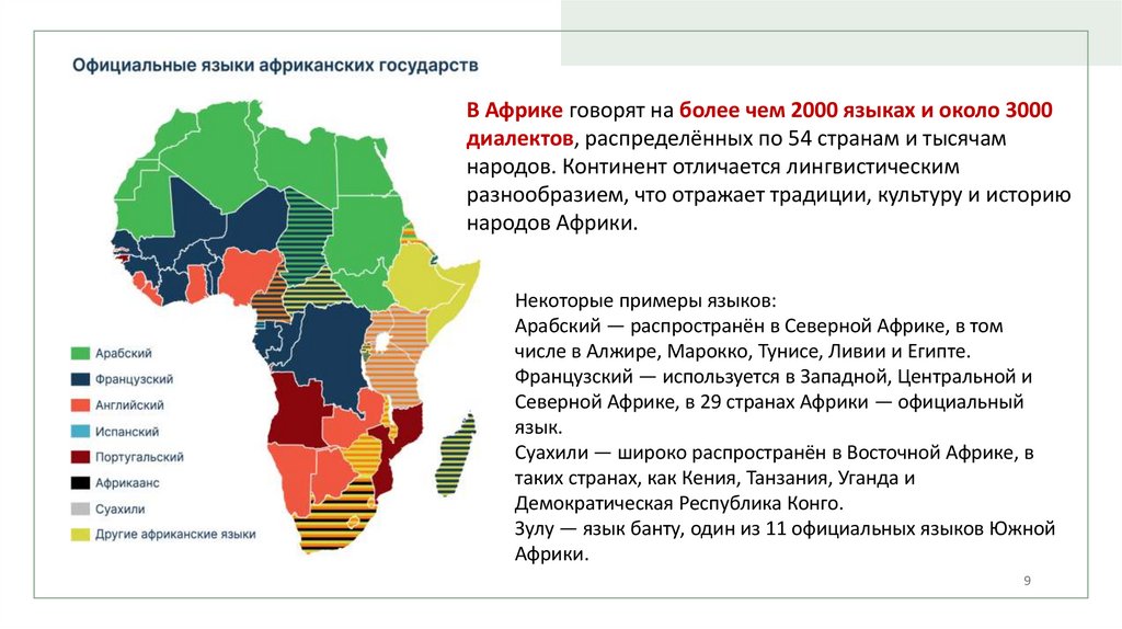 В Африке говорят на более чем 2000 языках и около 3000диалектов, распределённых по 54 странам и тысячам
