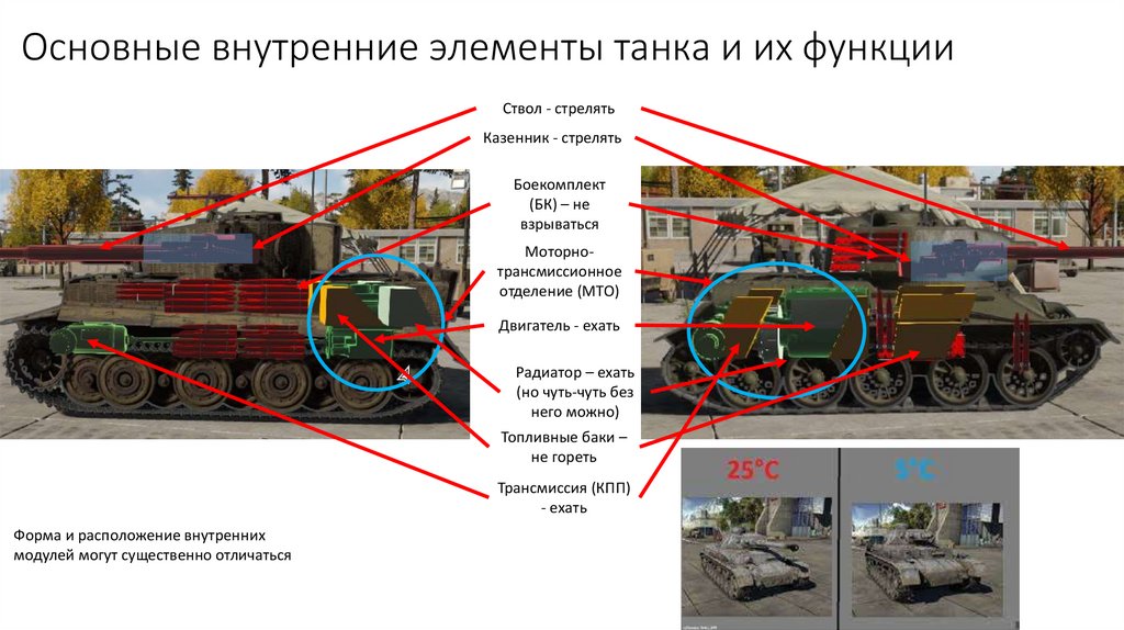 Основные внутренние элементы танка и их функцииСтвол - стрелять