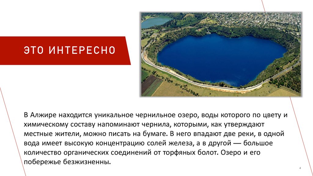 ЭТО ИН Т ЕРЕСНОВ Алжире находится уникальное чернильное озеро, воды которого по цвету и