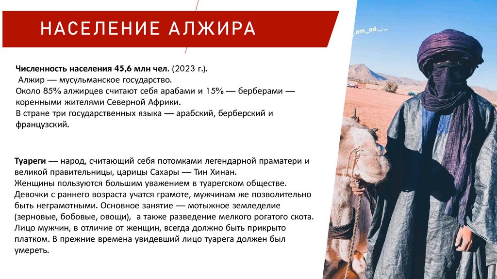 НАСЕЛЕНИЕ АЛЖИРАЧисленность населения 45,6 млн чел. (2023 г.).