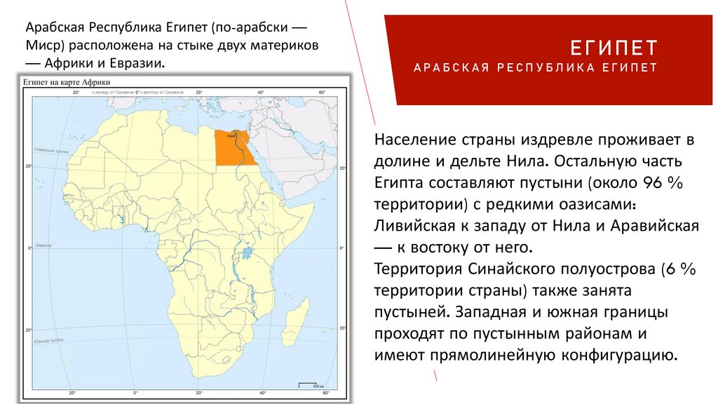 Арабская Республика Египет (по-арабски —Миср) расположена на стыке двух материков
