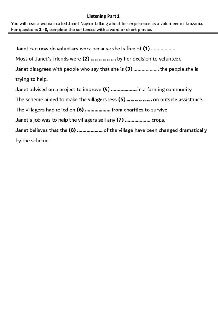 Listening Part 1You will hear a woman called Janet Naylor talking about her experience as a volunteer in Tanzania.