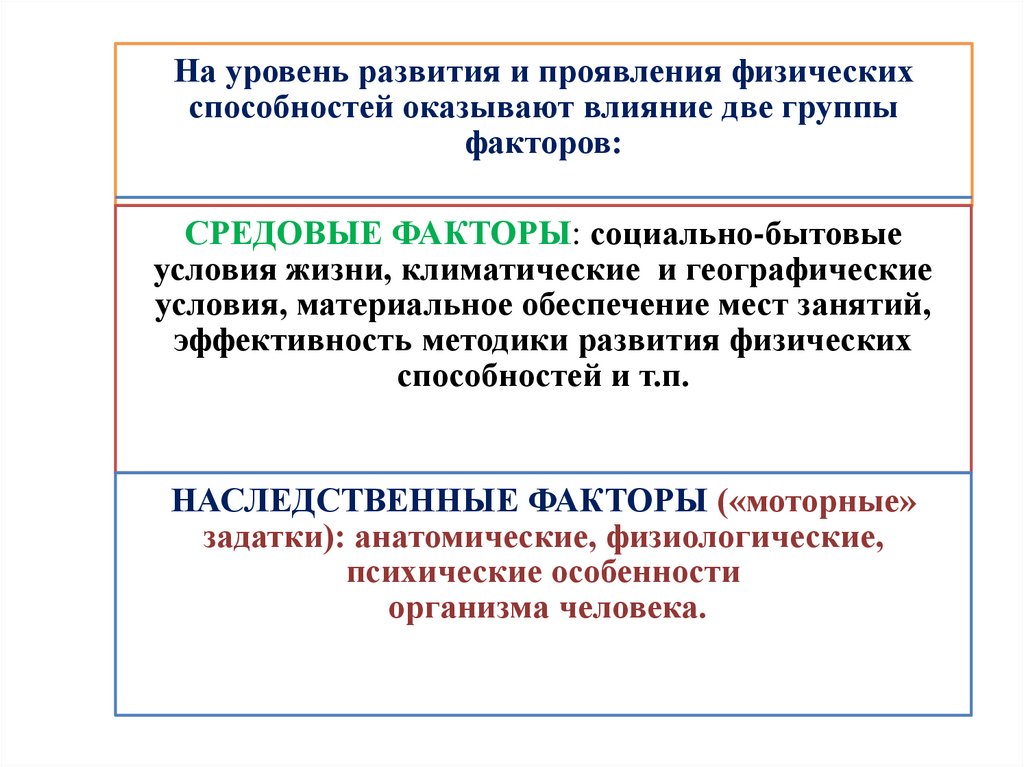 На уровень развития и проявления физическихспособностей оказывают влияние две группы