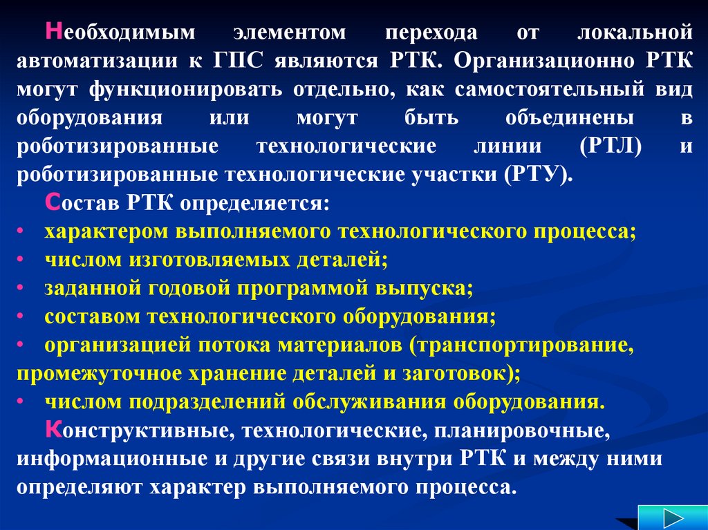 автоматизации к ГПС являются РТК. Организационно РТК