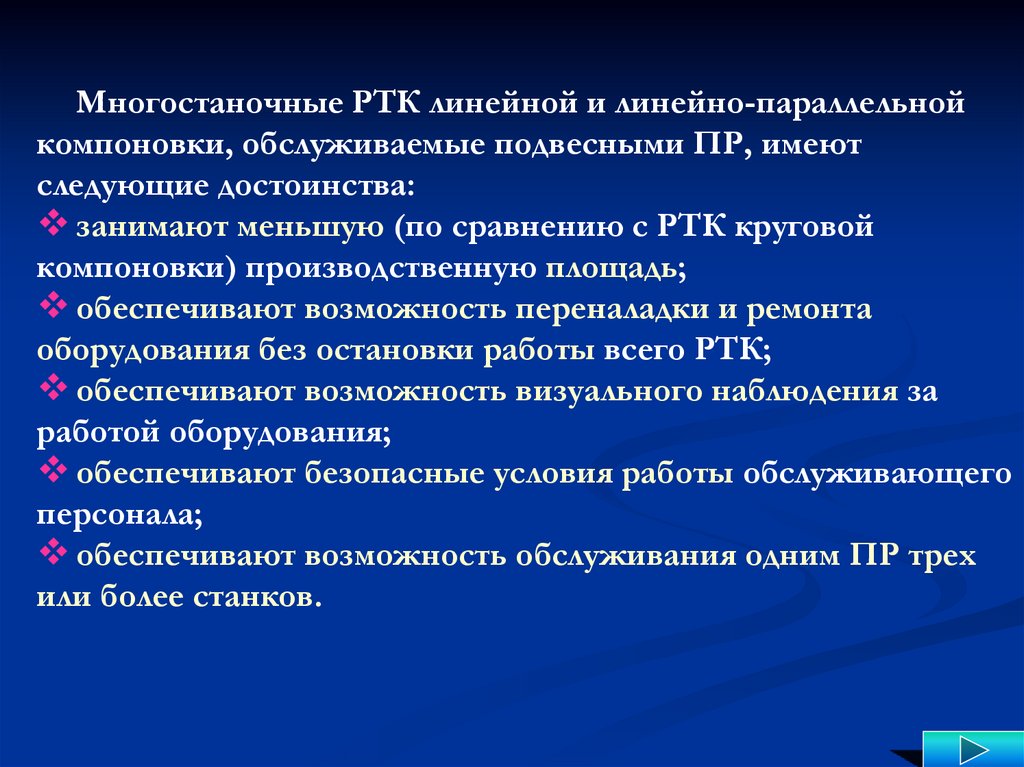 Многостаночные РТК линейной и линейно-параллельнойкомпоновки, обслуживаемые подвесными ПР, имеют