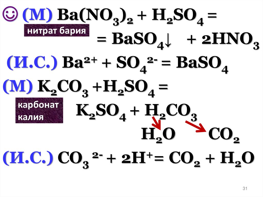 30. ☺ Серная кислота взаимодей-ствует с солями, если образуется газ или осадок.↓