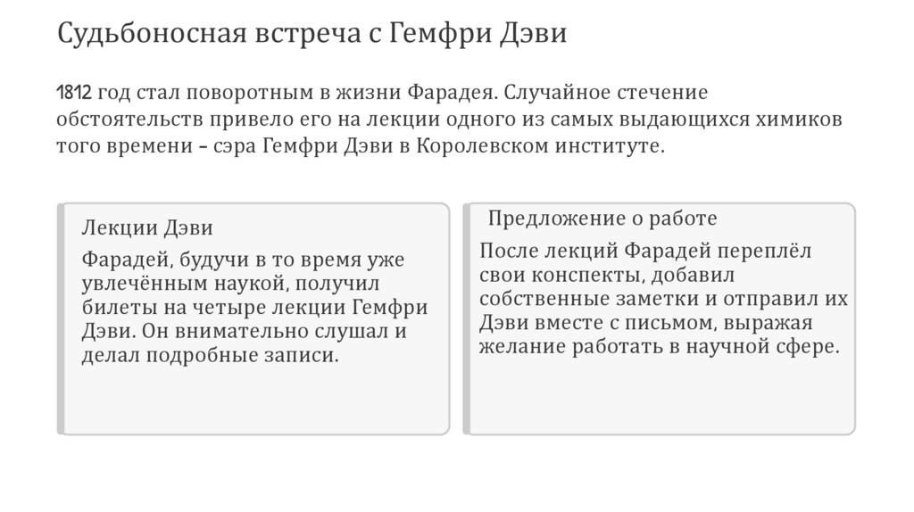 Судьбоносная встреча с Гемфри Дэви1812 год стал поворотным в жизни Фарадея. Случайное стечение