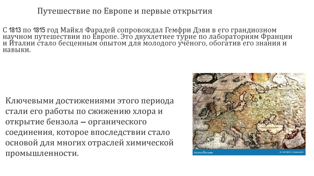 Путешествие по Европе и первые открытияС 1813 по 1815 год Майкл Фарадей сопровождал Гемфри Дэви в его грандиозном