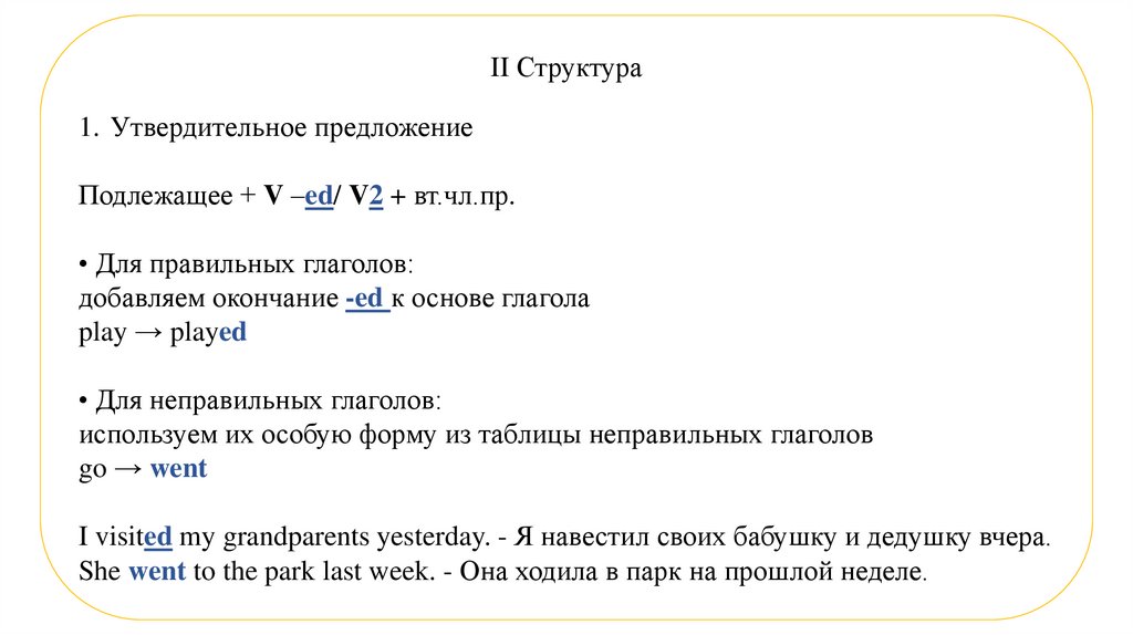 Подлежащее + V –ed/ V2 + вт.чл.пр.