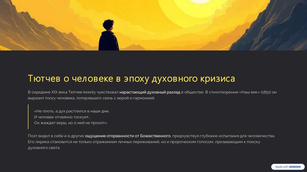 Тютчев о человеке в эпоху духовного кризисаВ середине XIX века Тютчев keenly чувствовал нарастающий духовный разлад в обществе. В стихотворении «Наш век» (1851) он