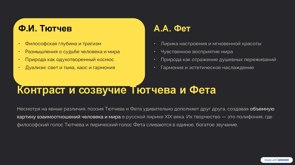 Несмотря на явные различия, поэзия Тютчева и Фета удивительно дополняет друг друга, создавая объемную