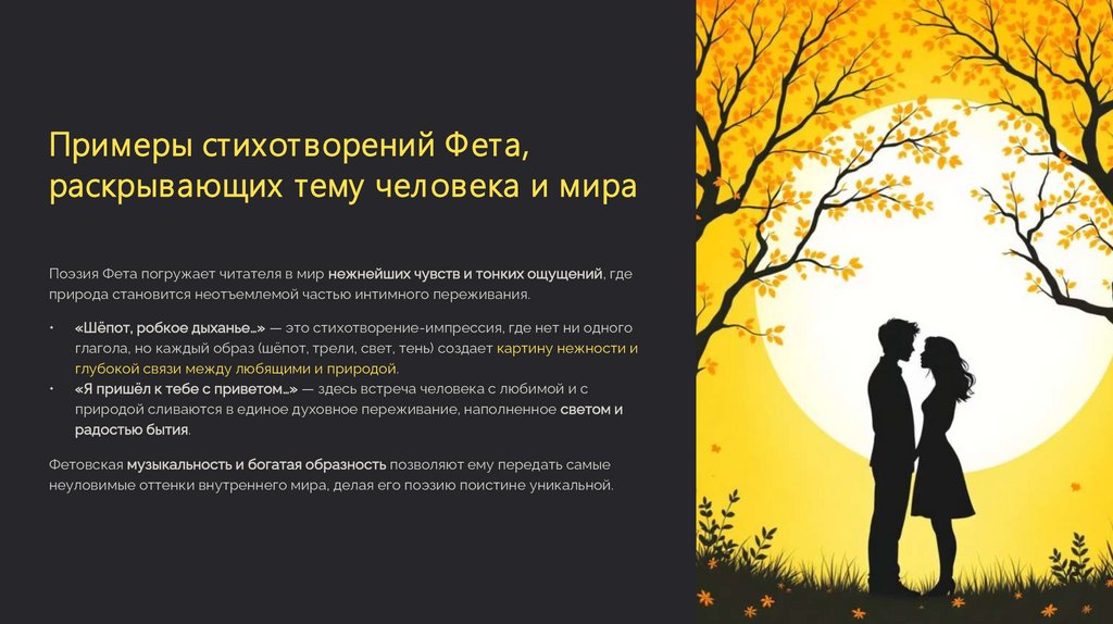 Примеры стихотворений Ф ета,раскрывающих тему человека и мира