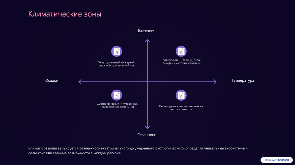 Климат Бразилии варьируется от влажного экваториального до умеренного субтропического, определяя уникальные экосистемы и