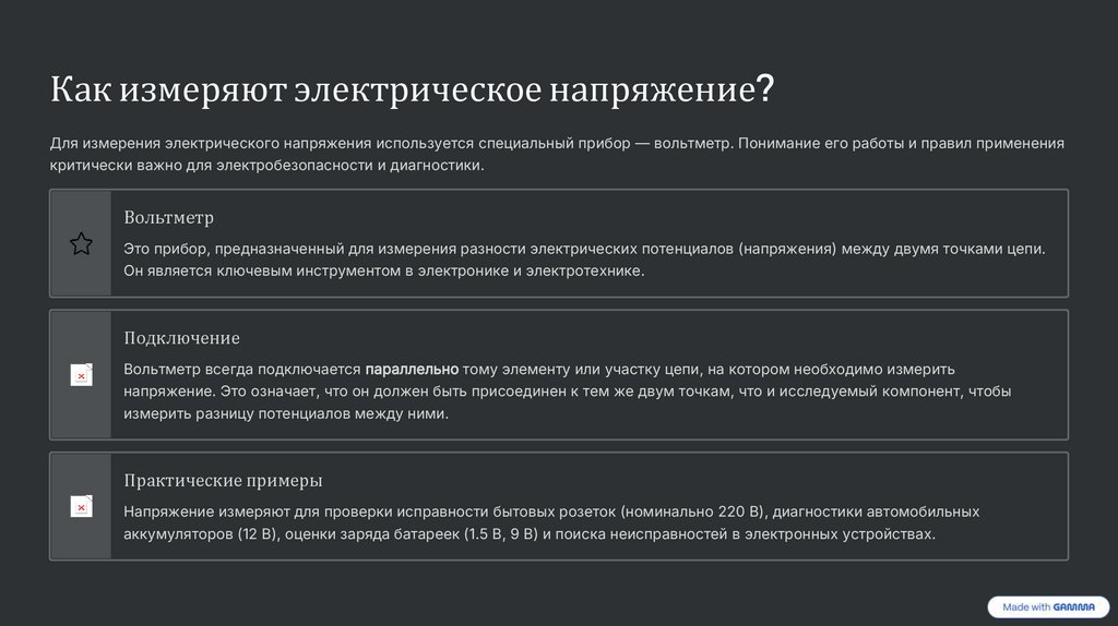 Как измеряют электрическое напряжение?Для измерения электрического напряжения используется специальный прибор — вольтметр. Понимание его работы и правил применения