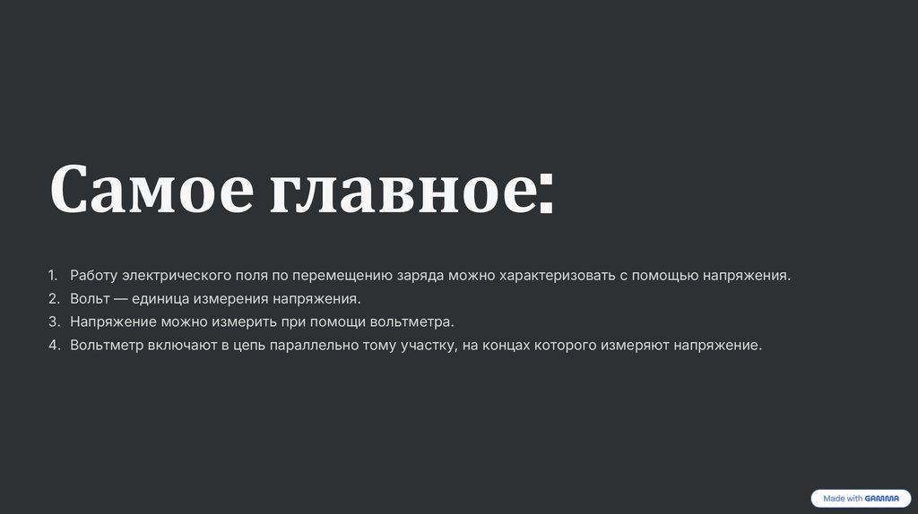 Самое главное:1. Работу электрического поля по перемещению заряда можно характеризовать с помощью напряжения.