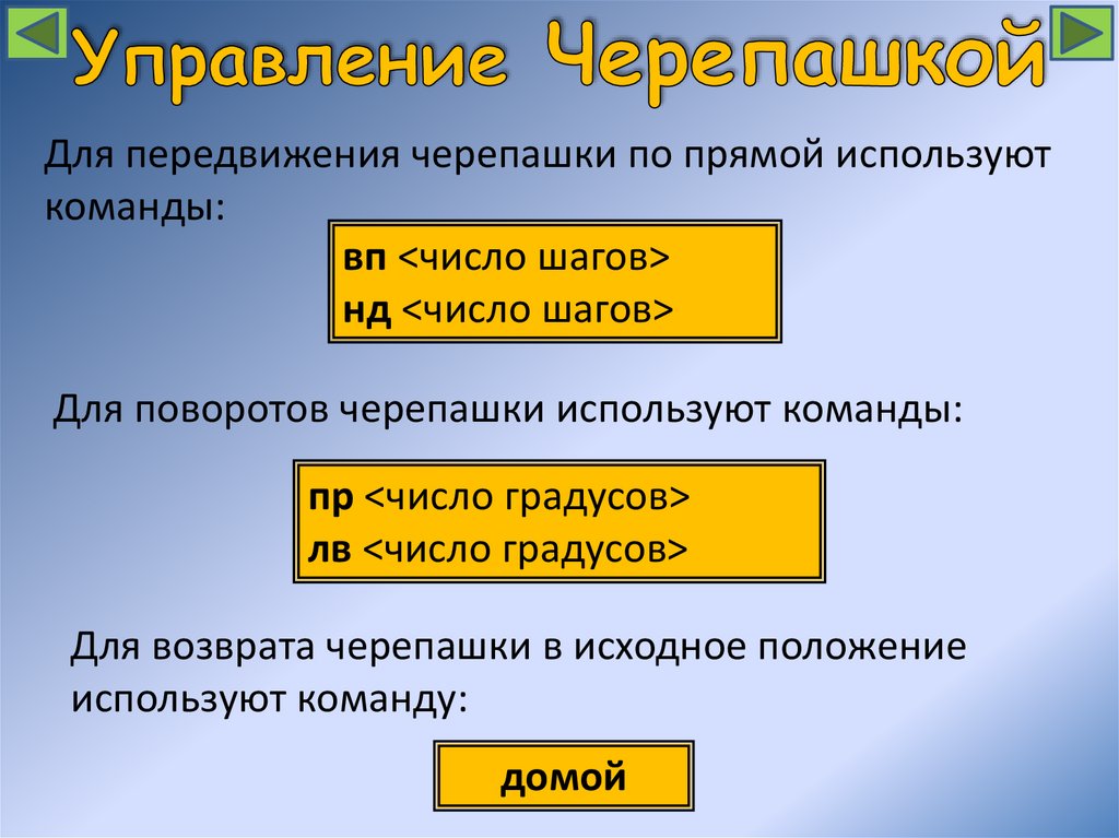 Для передвижения черепашки по прямой используюткоманды: