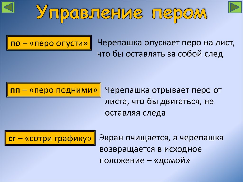 по – «перо опусти» Черепашка опускает перо на лист,что бы оставлять за собой след