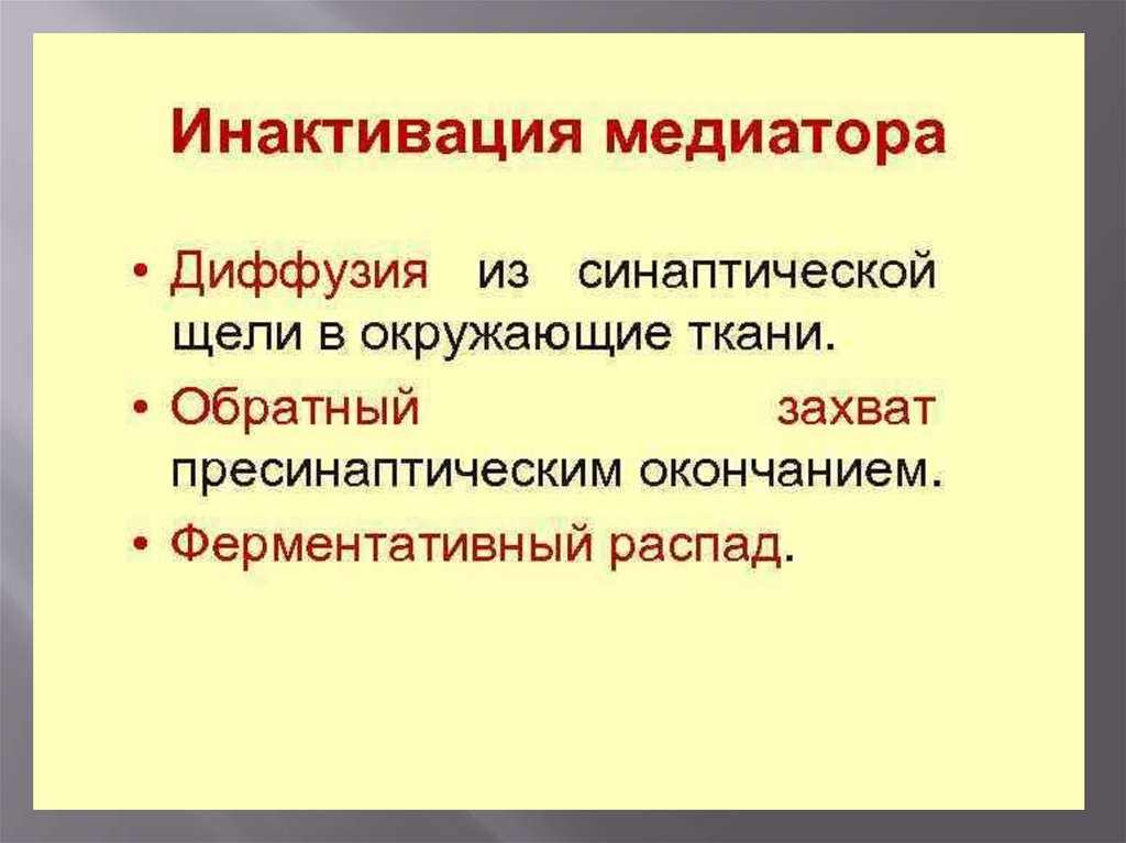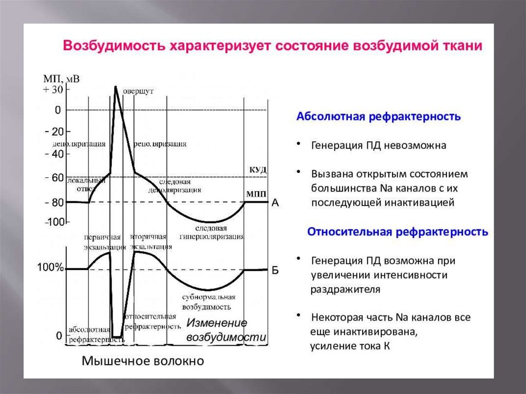 Гиперполяризация (выход ионов калия и/или вход ионов хлора)Длительная деполяризация (инактивация открытых натриевых
