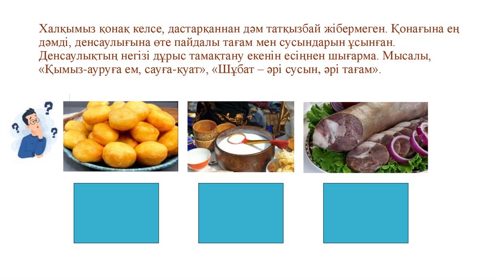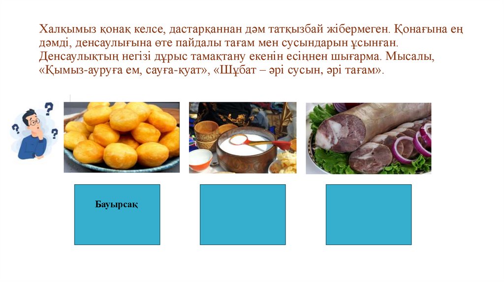 Халқымыз қонақ келсе, дастарқаннан дәм татқызбай жібермеген. Қонағына еңдәмді, денсаулығына өте пайдалы тағам мен сусындарын ұсынған.