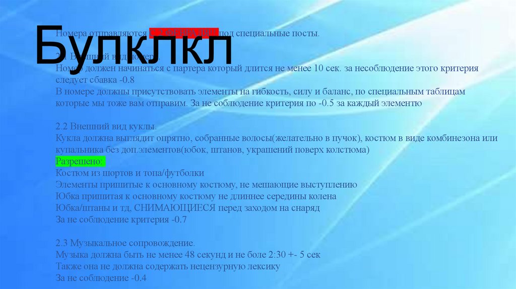 Номер должен начинаться с партера который длится не менее 10 сек. за несоблюдение этого критерия