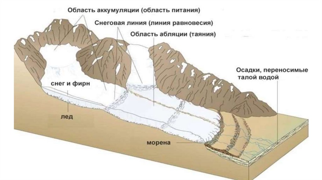 Новообразованный лед постепенно перетекает из верхней области питания в нижнюю область абляции, где