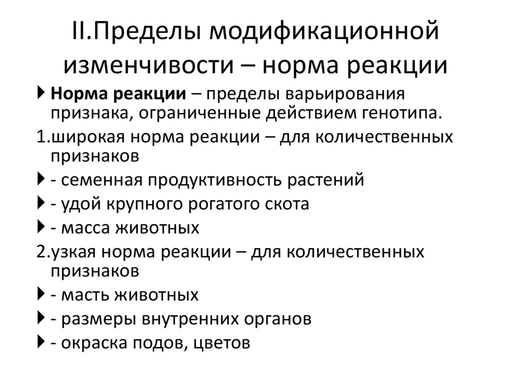 II.Пределы модификационнойизменчивости – норма реакции