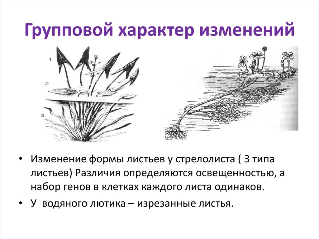 Групповой характер изменений• Изменение формы листьев у стрелолиста ( 3 типа