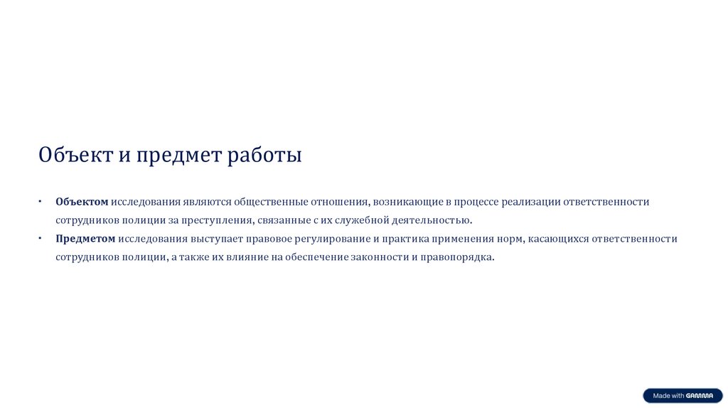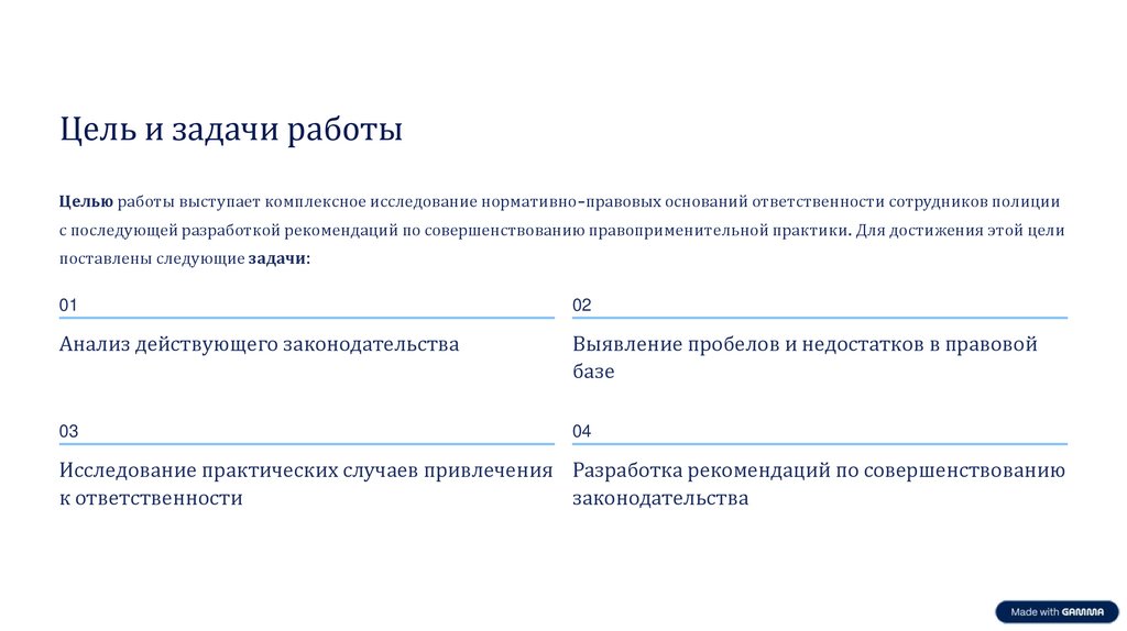 Цель и задачи работыЦелью работы выступает комплексное исследование нормативно-правовых оснований ответственности сотрудников полиции