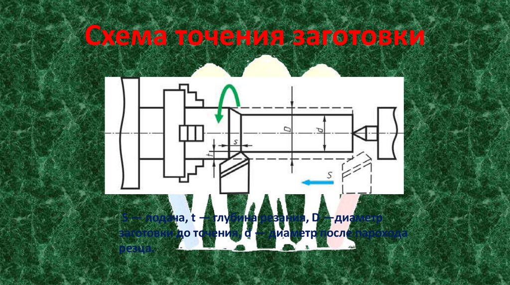 Схема точения заготовкиS — подача, t — глубина резания, D —диаметр