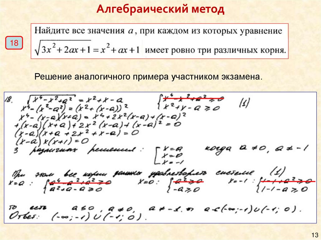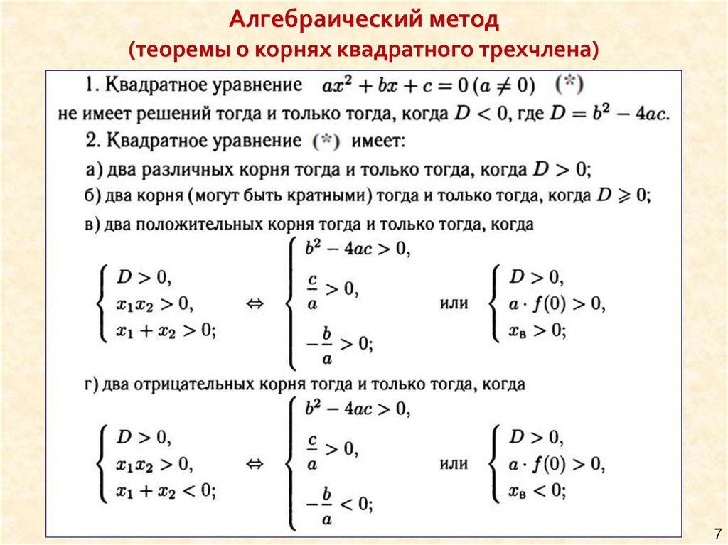 Алгебраический метод(теоремы о корнях квадратного трехчлена)