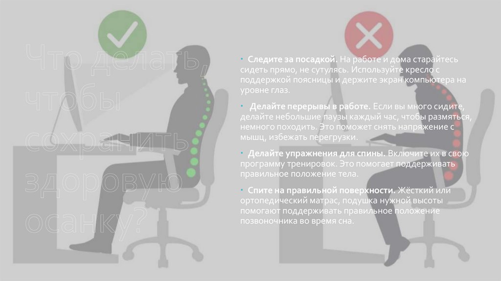 Следите за посадкой. На работе и дома старайтесьсидеть прямо, не сутулясь. Используйте кресло с