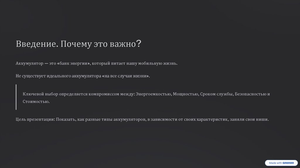 Цель презентации: Показать, как разные типы аккумуляторов, в зависимости от своих характеристик, заняли свои ниши.
