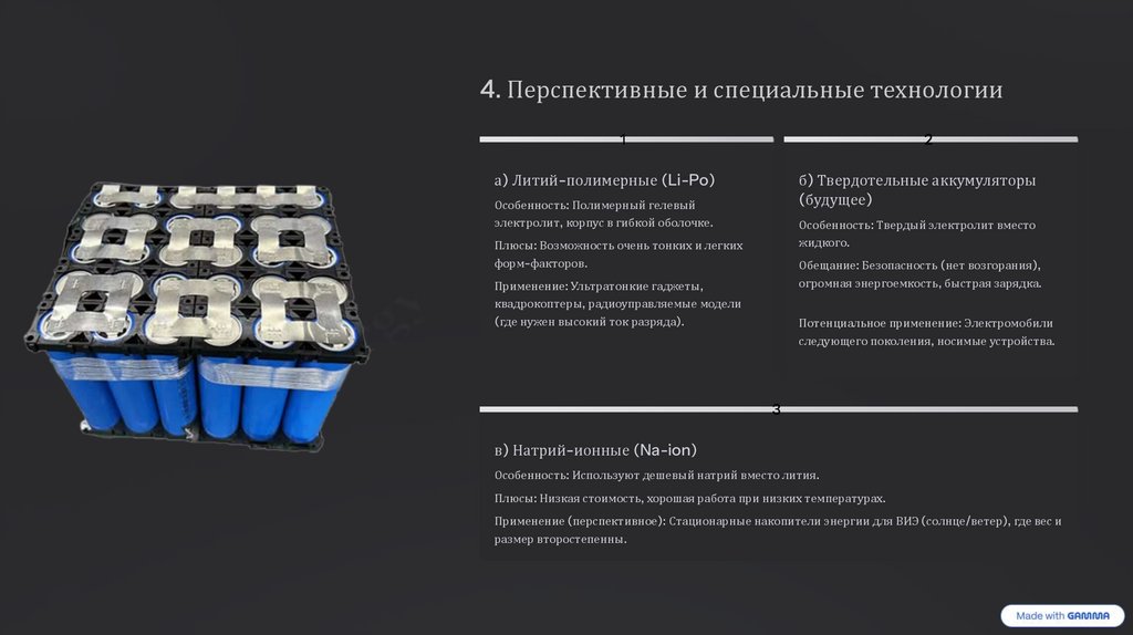 Применение (перспективное): Стационарные накопители энергии для ВИЭ (солнце/ветер), где вес и