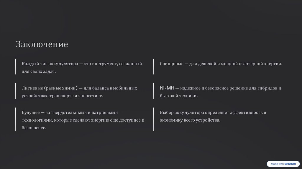 ЗаключениеКаждый тип аккумулятора — это инструмент, созданный