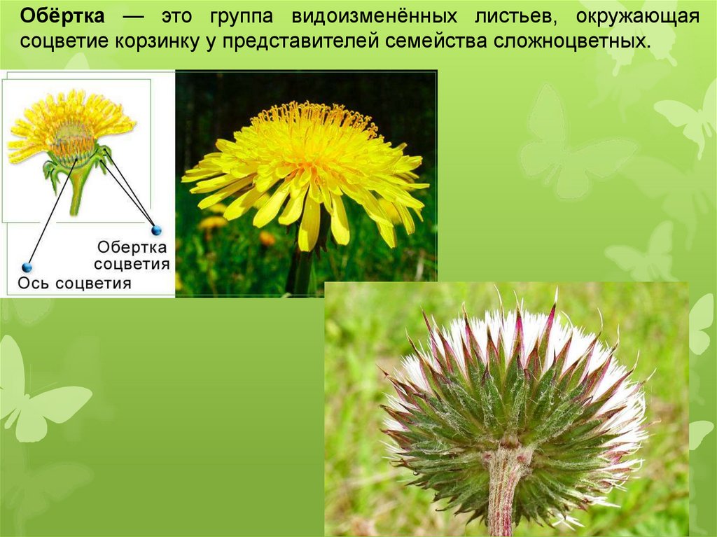 Обёртка — это группа видоизменённых листьев, окружающаясоцветие корзинку у представителей семейства сложноцветных.