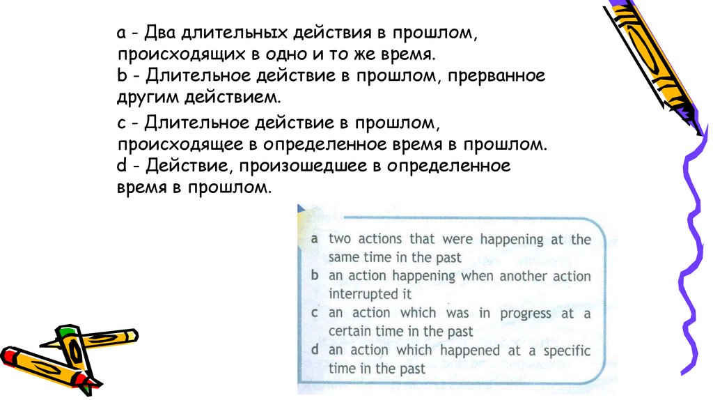 а - Два длительных действия в прошлом,происходящих в одно и то же время.