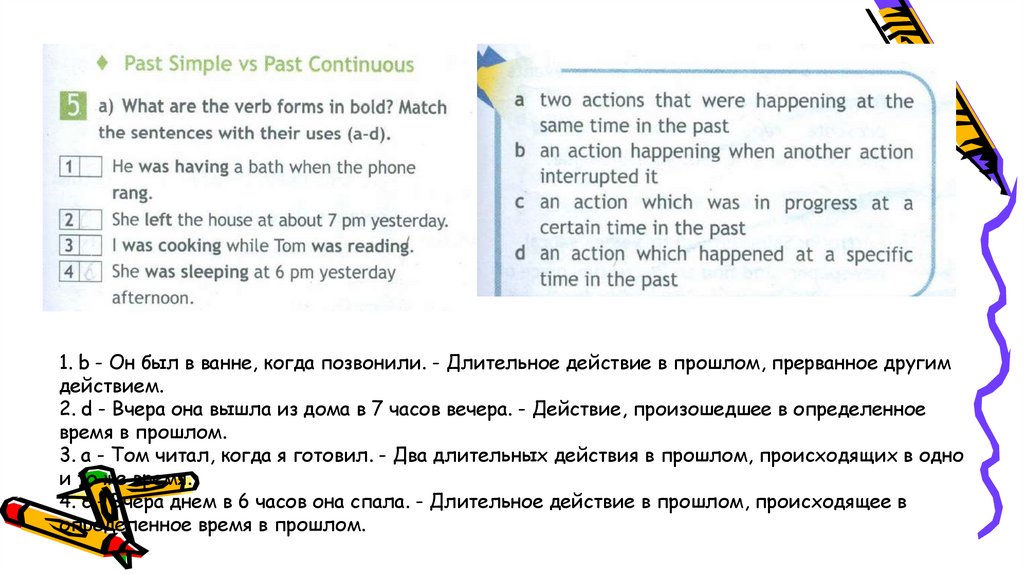 1. b - Он был в ванне, когда позвонили. - Длительное действие в прошлом, прерванное другимдействием.