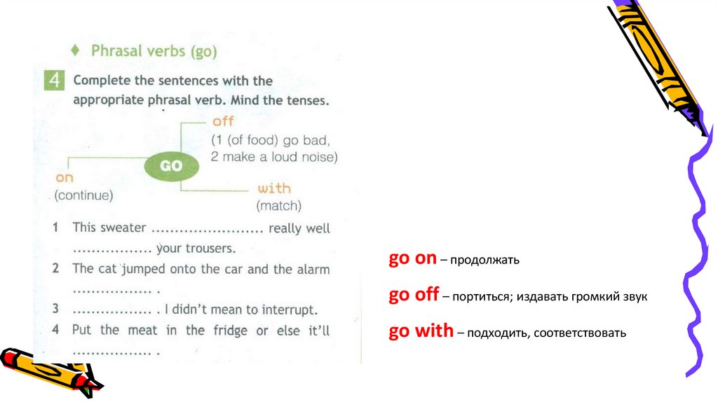go on – продолжатьgo off – портиться; издавать громкий звук