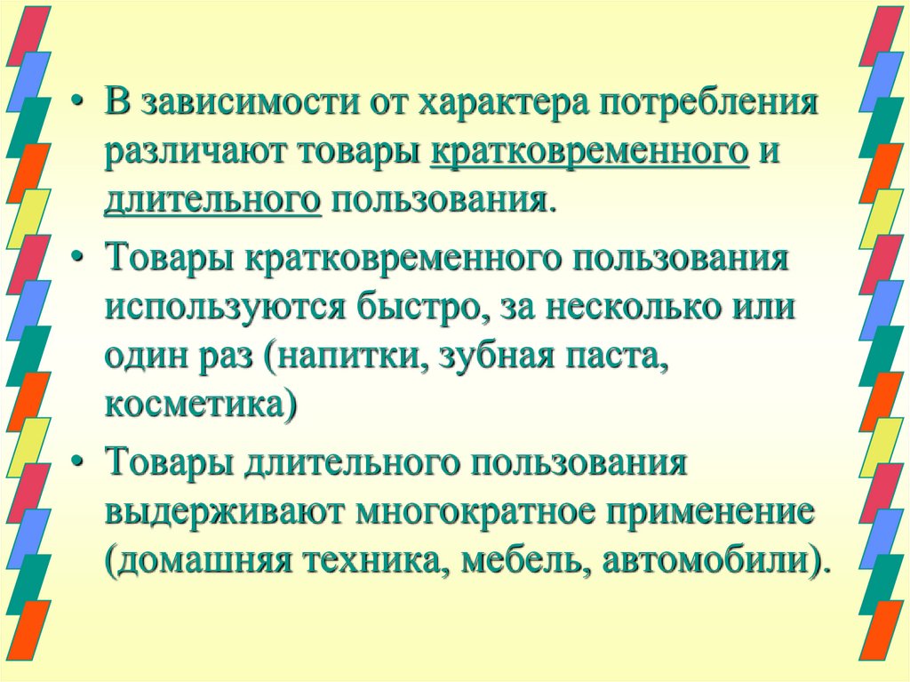 • В зависимости от характера потребленияразличают товары кратковременного и