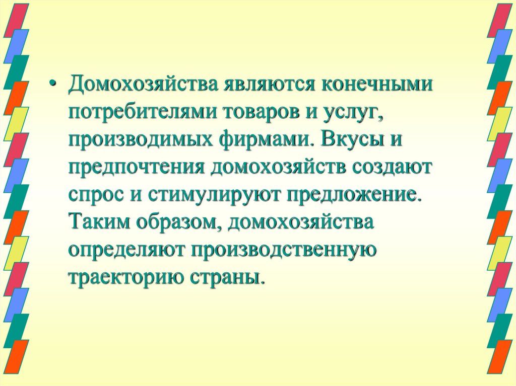 • Домохозяйства являются конечнымипотребителями товаров и услуг,