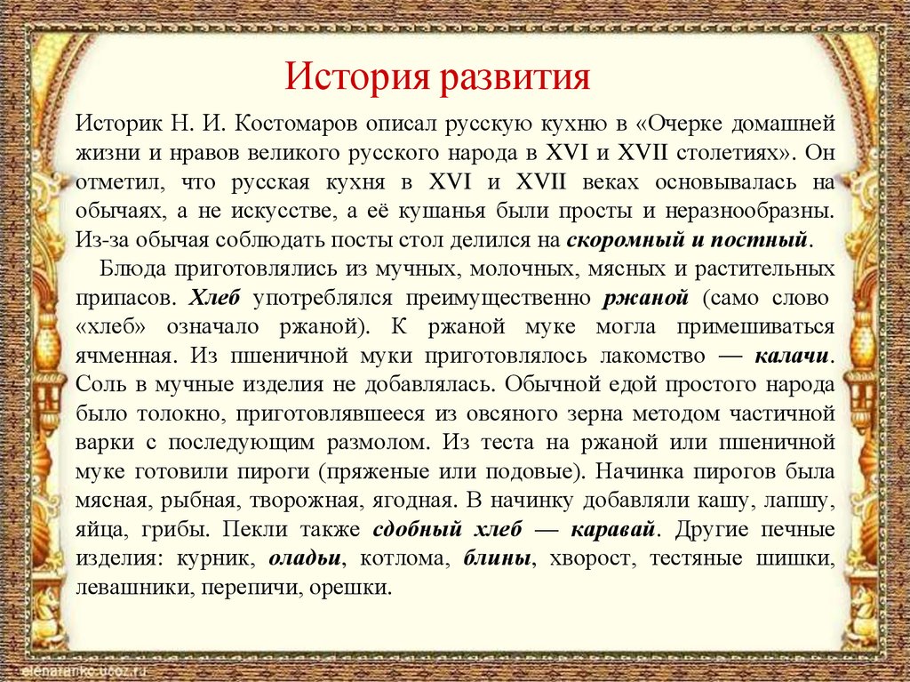 История развитияИсторик Н. И. Костомаров описал русскую кухню в «Очерке домашней