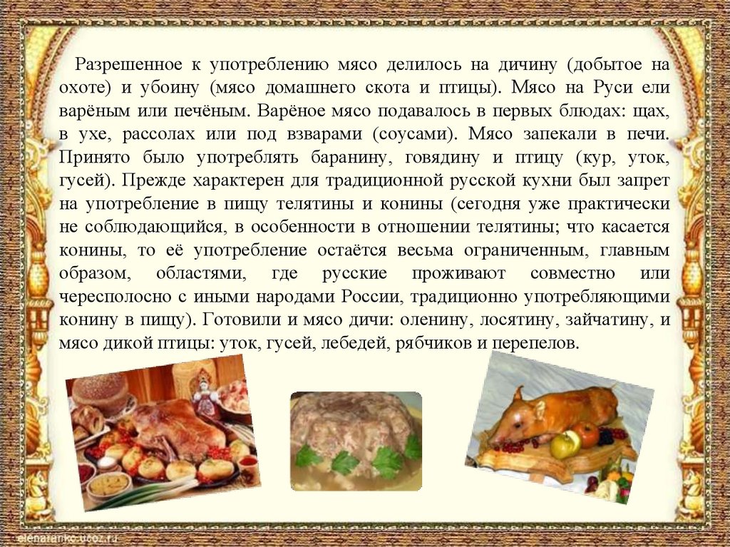 Разрешенное к употреблению мясо делилось на дичину (добытое наохоте) и убоину (мясо домашнего скота и птицы). Мясо на Руси ели
