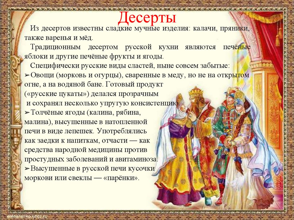 ДесертыИз десертов известны сладкие мучные изделия: калачи, пряники,