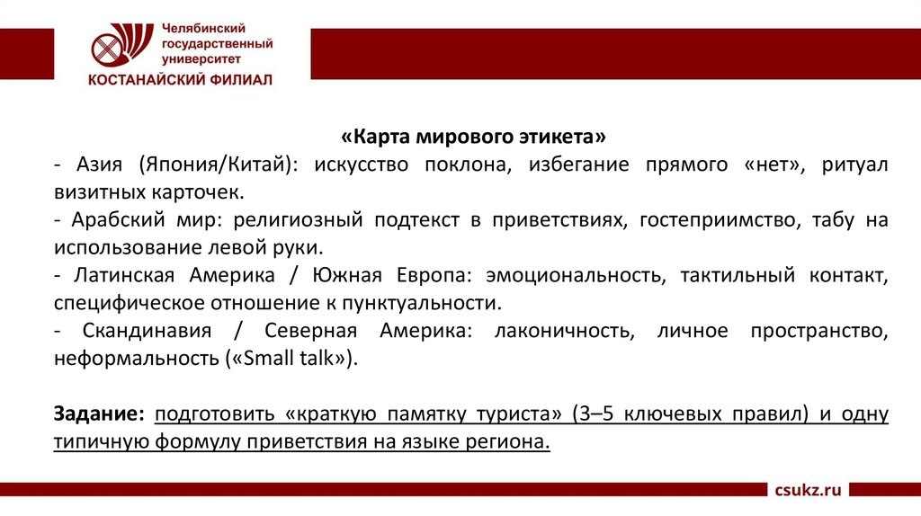 - Латинская Америка / Южная Европа: эмоциональность, тактильный контакт,