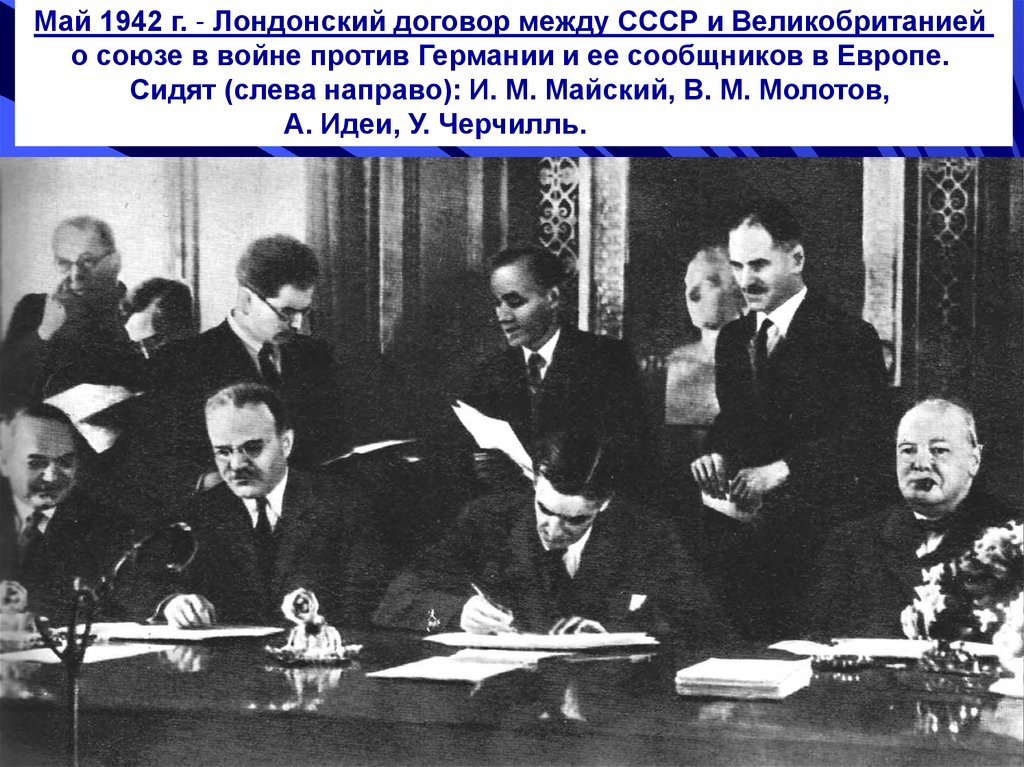 Май 1942 г. - Лондонский договор между СССР и Великобританиейо союзе в войне против Германии и ее сообщников в Европе.