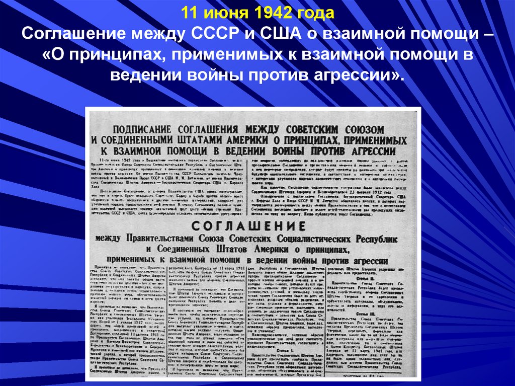 11 июня 1942 годаСоглашение между СССР и США о взаимной помощи –