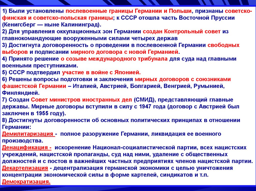 1) Были установлены послевоенные границы Германии и Польши, признаны советскофинская и советско-польская границы; к СССР отошла часть Восточной Пруссии(Кенигсберг — ныне Калининград).