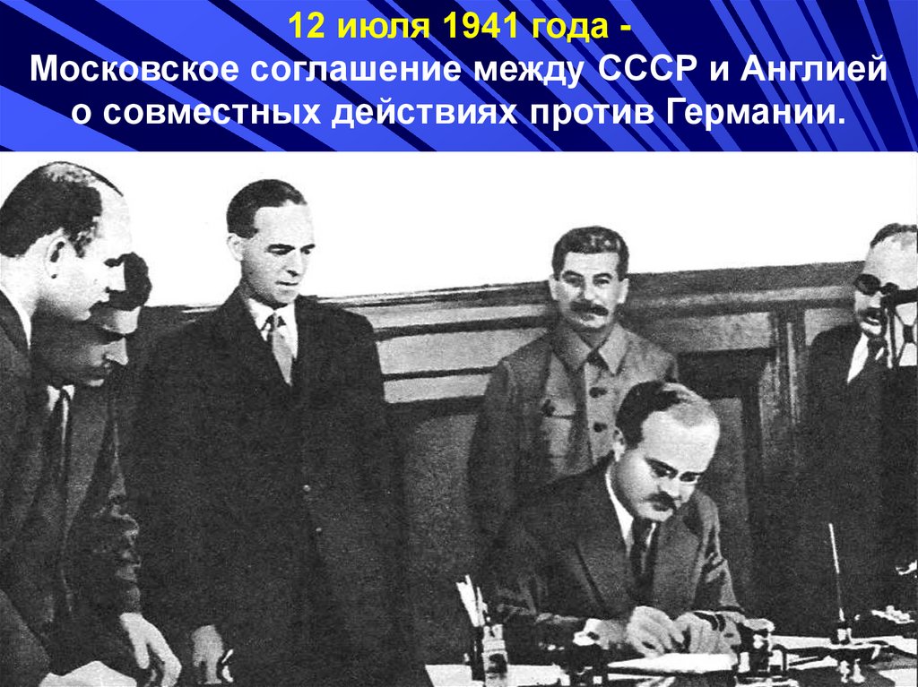 12 июля 1941 года Московское соглашение между СССР и Англиейо совместных действиях против Германии.