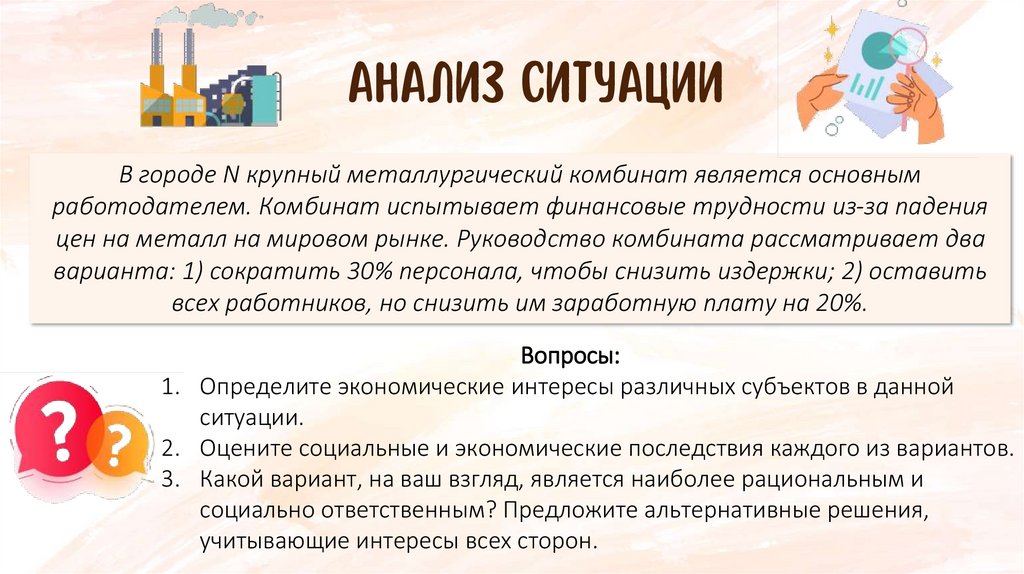 Ответы к ситуации1. Работники стремятся сохранить работу и зарплату, руководство финансовую устойчивость. Город N заинтересован в стабильности,